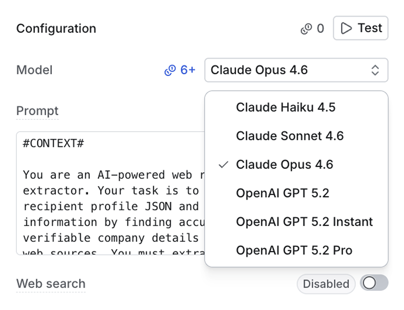 Web search is also available for Anthropic models. When enabled, the agent can crawl webpages to gather information, which is useful for enriching data from a recipient's domain or website.