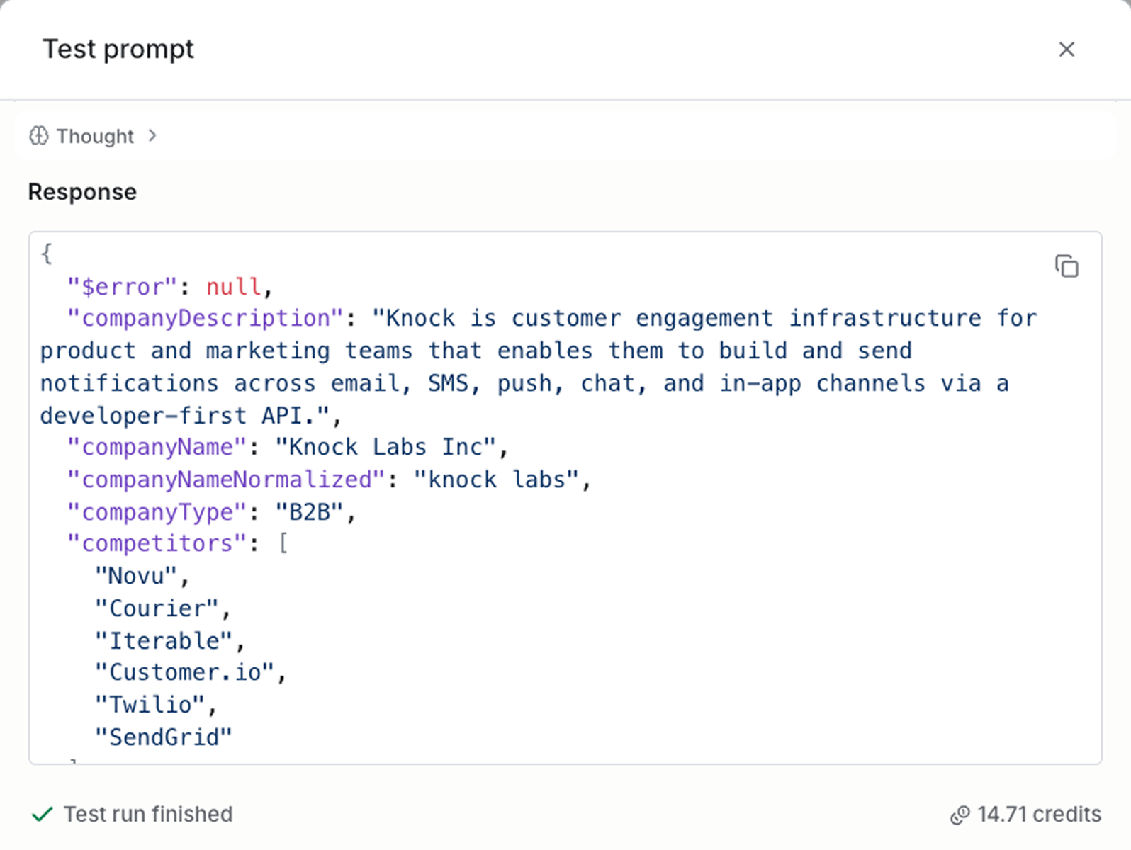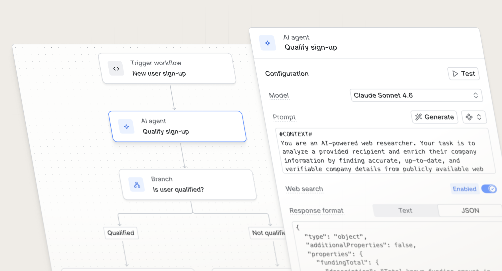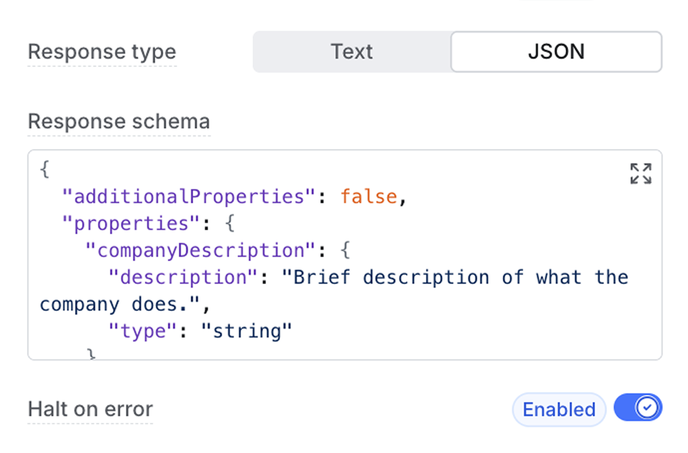 You can also set the response format to JSON and provide a schema for the output to adhere to. This ensures structured data and makes AI agent responses usable for enrichment and personalization purposes.