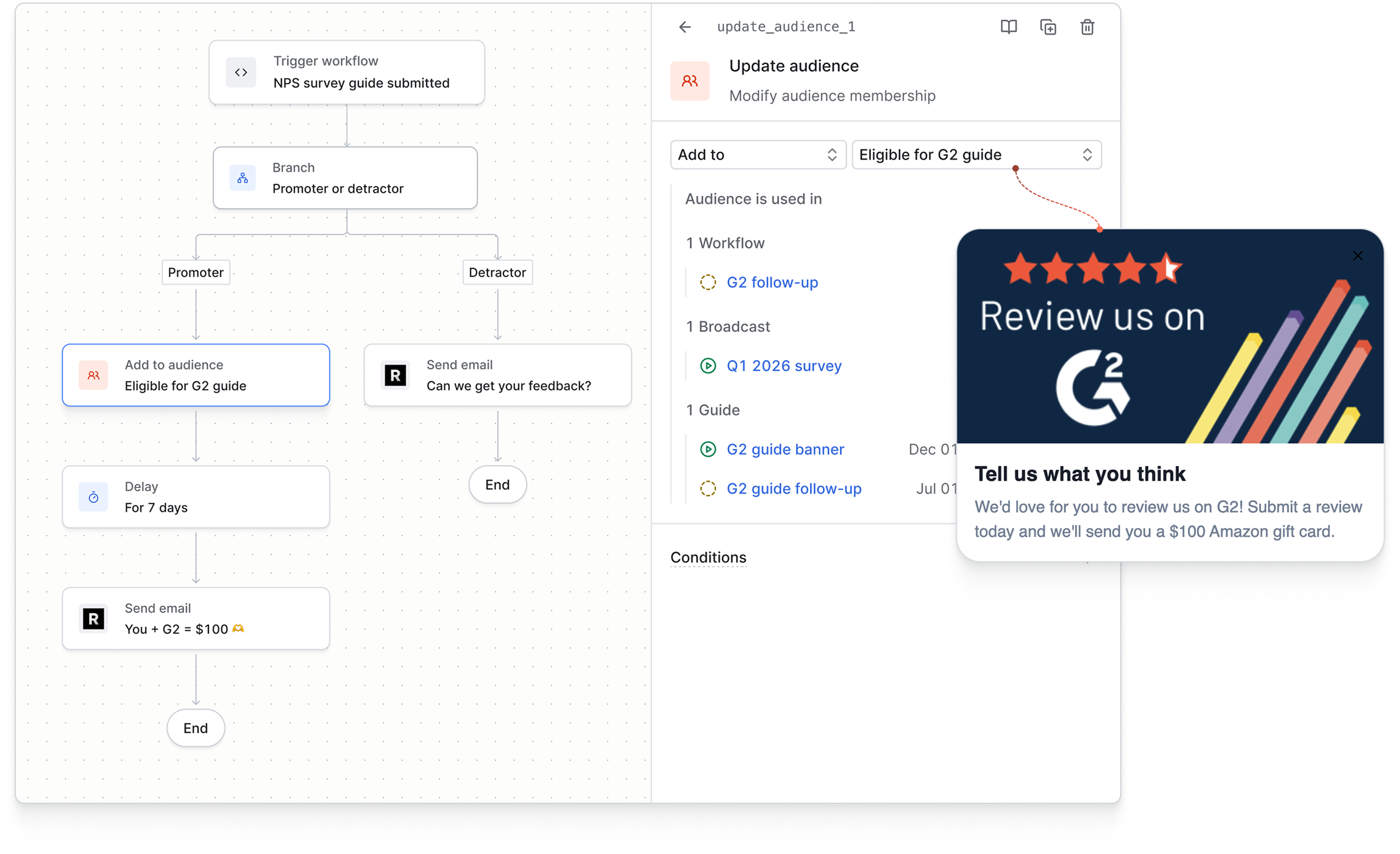 Using audience membership to trigger other messaging. Audiences in Knock gate which users are eligible for guides and broadcasts. When you add a user to an audience from within a workflow—say, when they complete a specific action or reach a milestone—they become immediately eligible for every guide and broadcast that targets that audience. You don't need to manage this outside of Knock. The workflow run handles it.