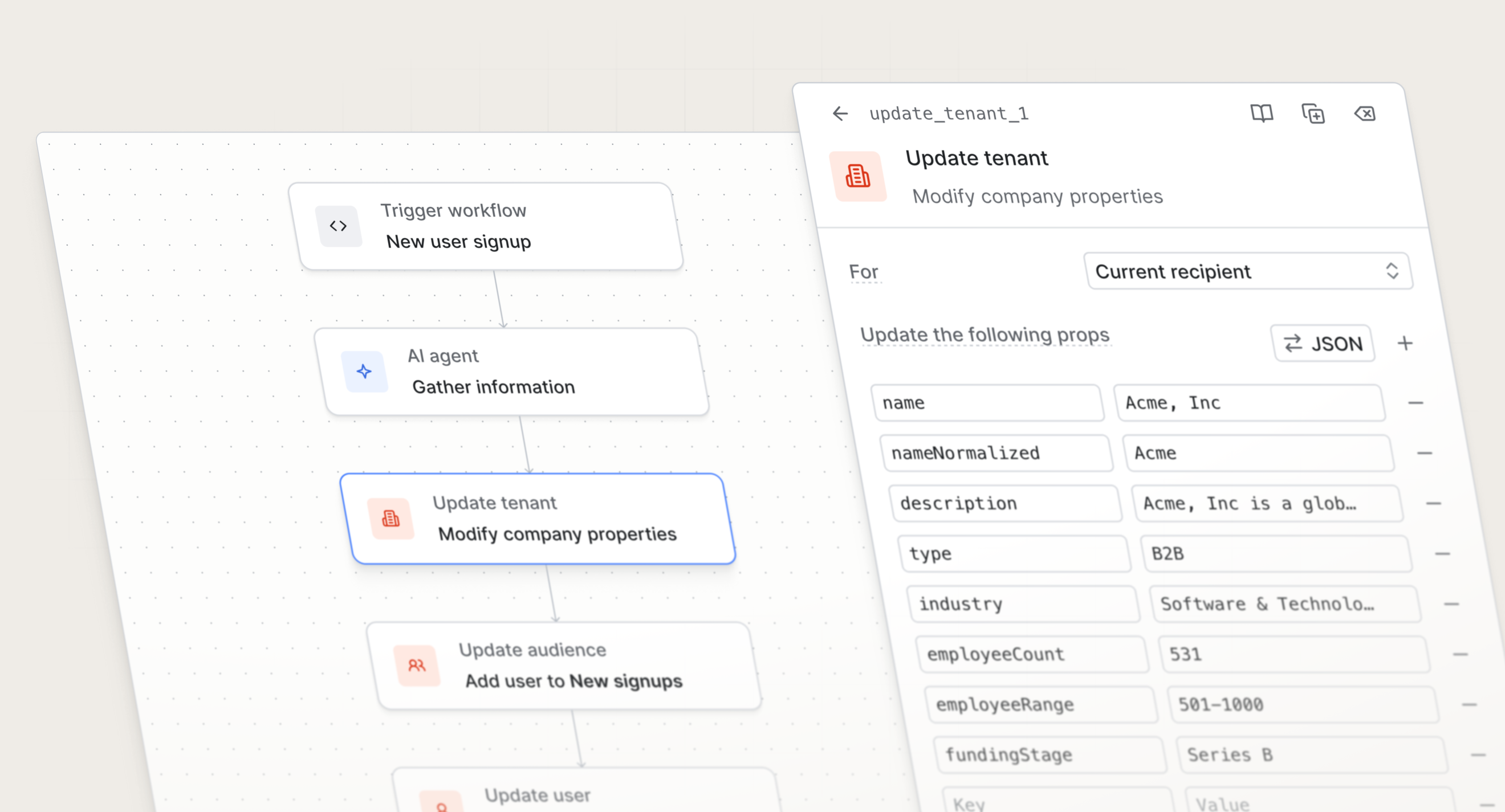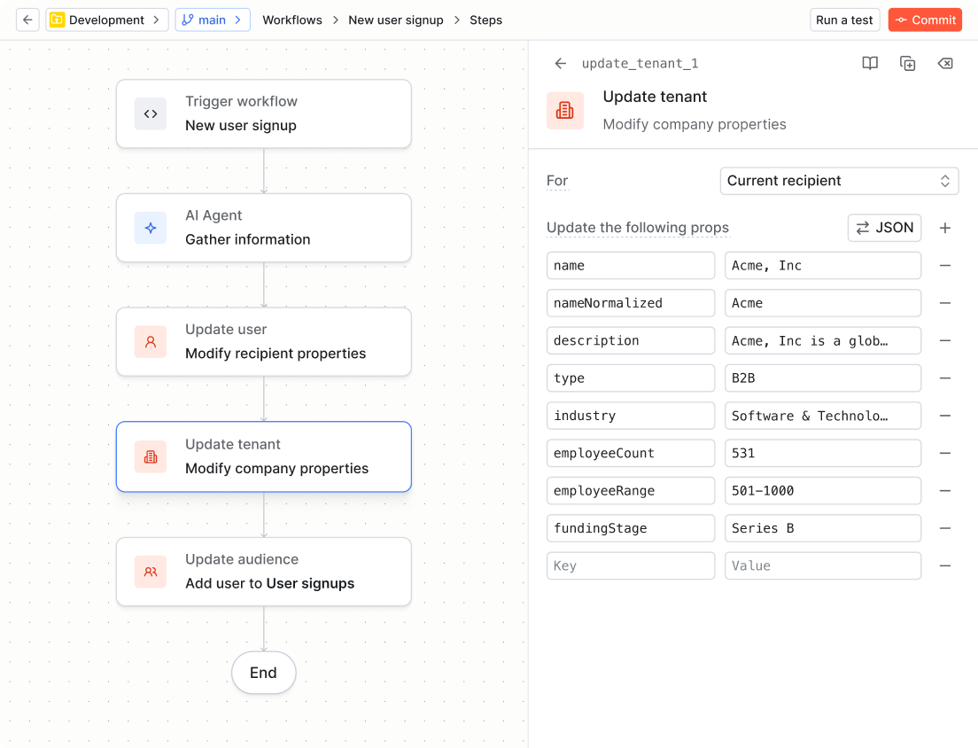 Enriching tenant properties with AI agent output. When you combine data functions with the AI agent function, you can run research or inference on a tenant during a workflow run, then write the result back to Knock as a tenant property. That property is then available across every workflow that runs in the context of that tenant—so the enrichment you do once propagates everywhere.