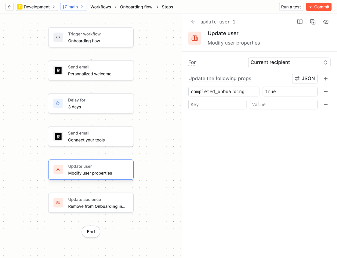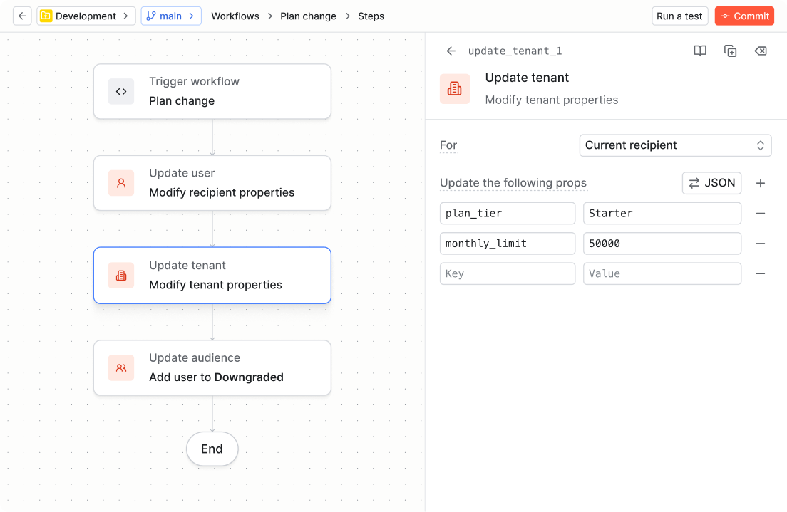 Keeping properties current so conditions stay accurate. Many of the most useful conditions in Knock depend on user or tenant properties being up to date. If a property like plan_tier or onboarding_complete falls out of sync with what's actually happened in your product, your messaging logic breaks quietly. Data functions let you update those properties at the exact moment the relevant event occurs, directly inside the workflow that handles it.
