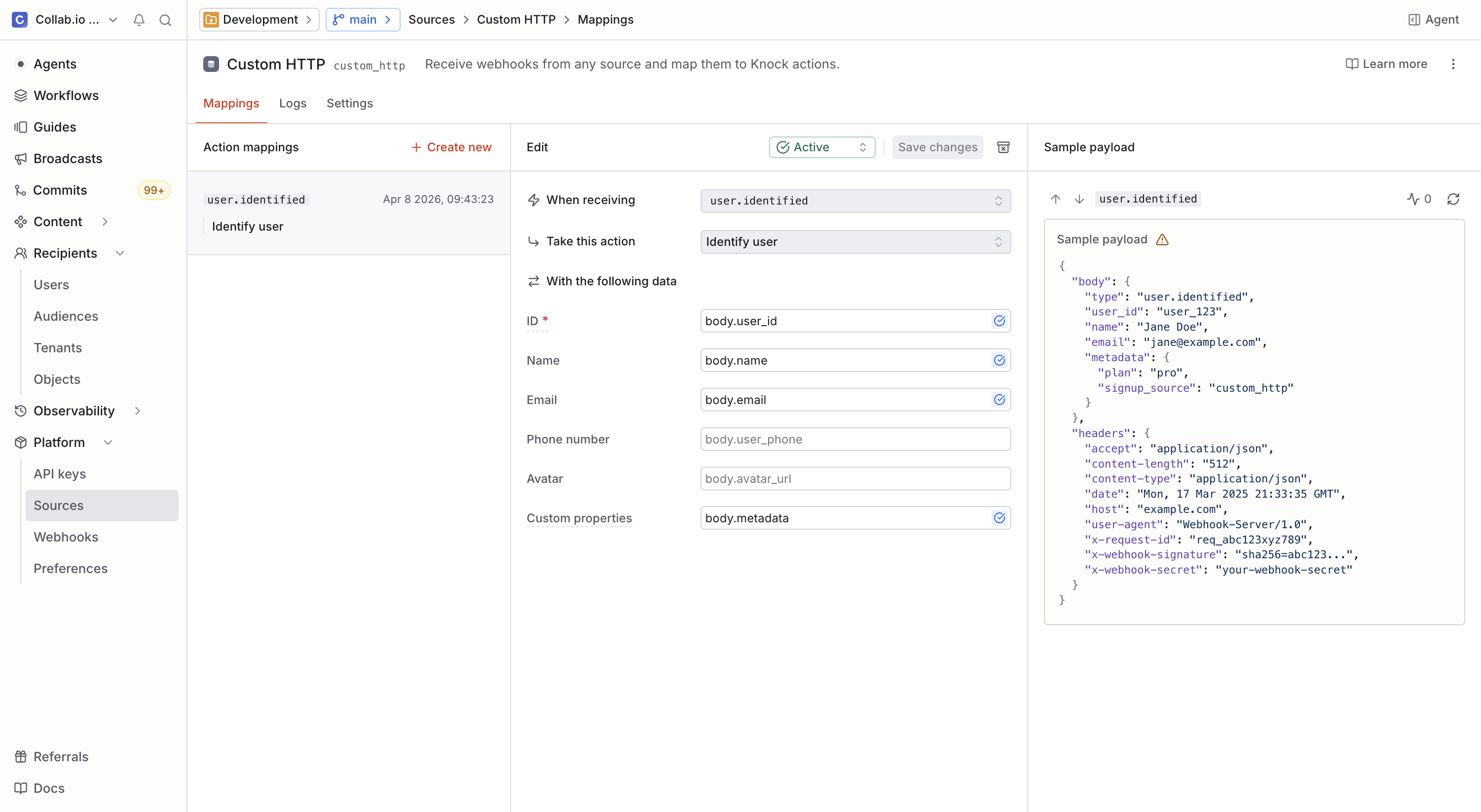 No more custom integrations to transform data. No in-house verification layer. Just send your events to Knock and map them to the action you want to trigger in a few clicks.