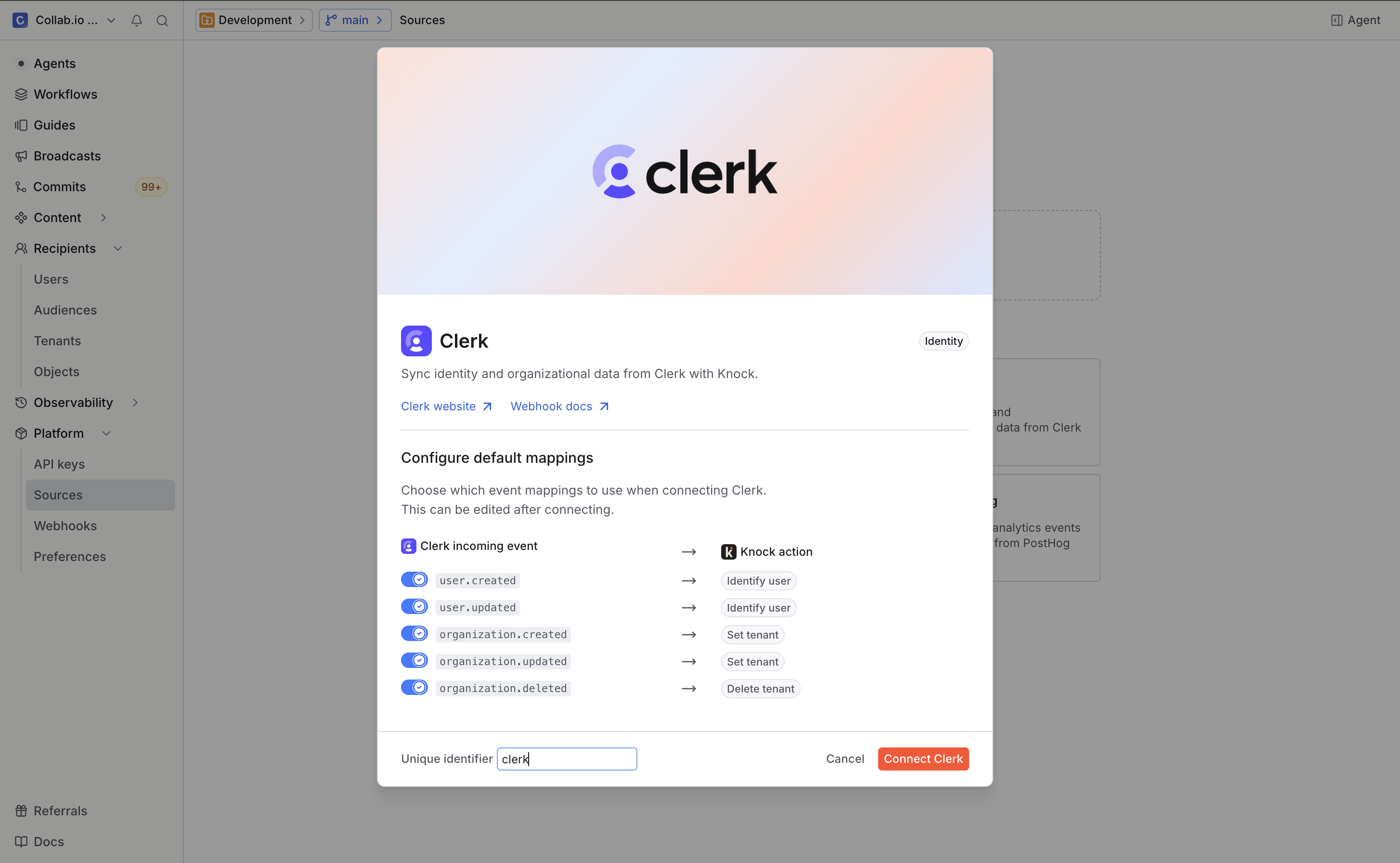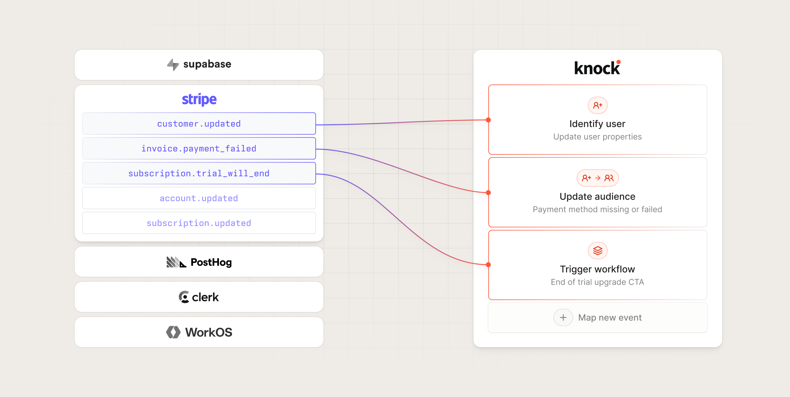 Now, when events occur in your other tools, like a new user in Clerk or a payment in Stripe, you can send that event data to Knock to create users, trigger workflows, and update audiences. Knock ingests, verifies, and transforms the event data for you to take action on.