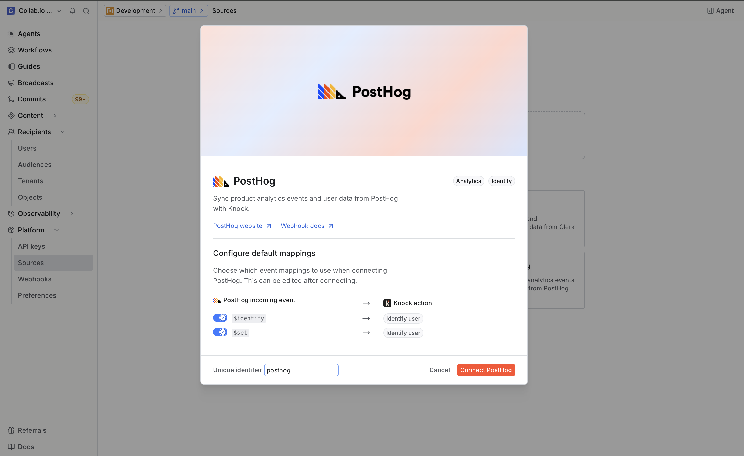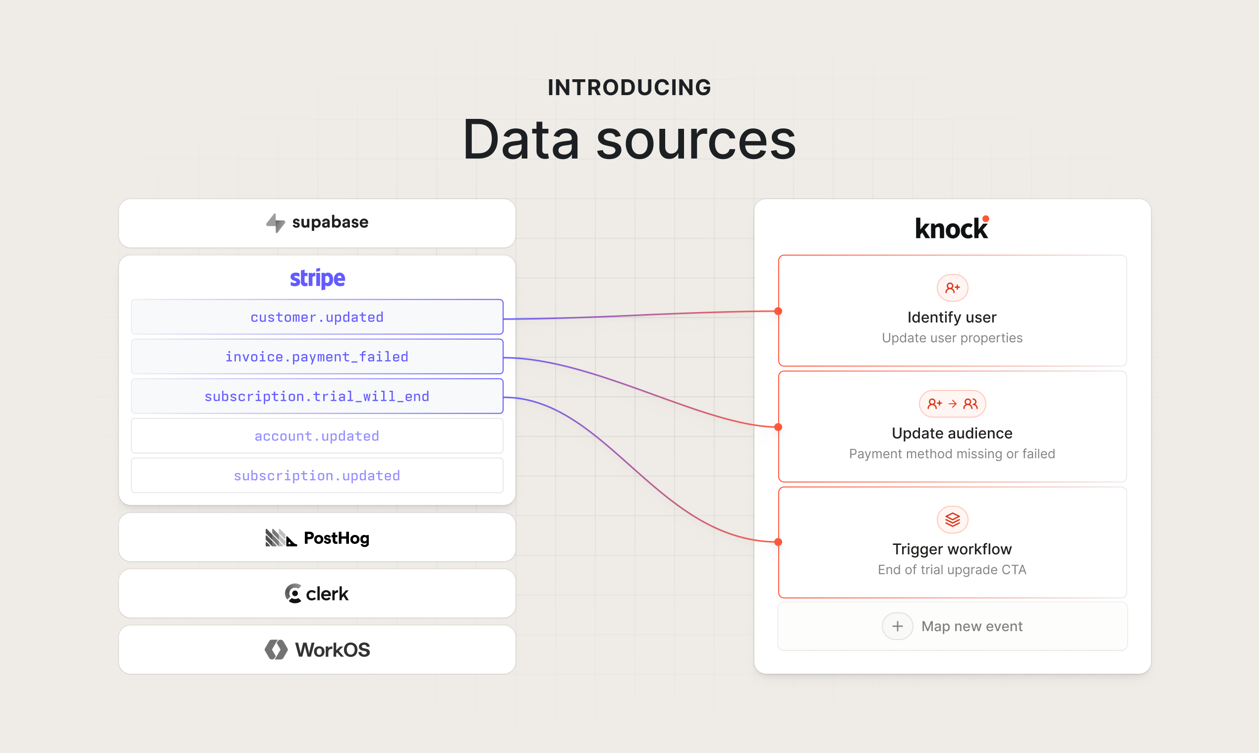 Today we're releasing data sources. With Knock data sources, in a few clicks you can connect events from any tool to your messaging infrastructure, no code required.