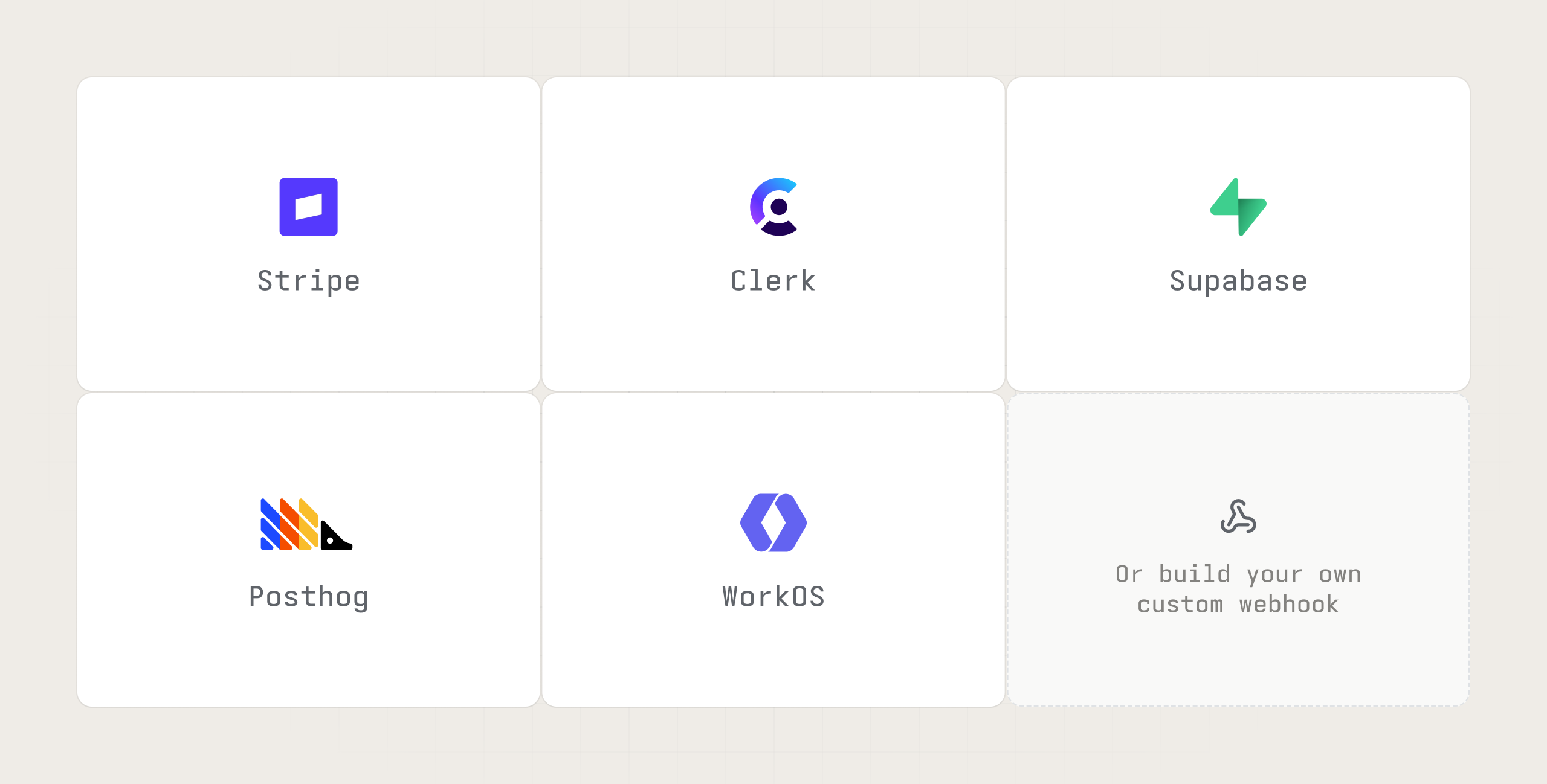 Today we're shipping five pre-configured data sources: Stripe, Supabase, PostHog, Clerk, and WorkOS.