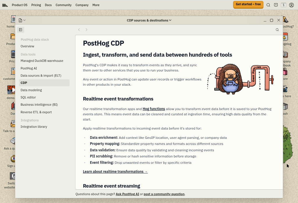 PostHog combines product analytics with CDP capabilities, offering event collection, transformation, and activation within a single platform. The platform provides real-time transformations, webhooks, and integrations alongside analytics, experimentation, and feature flags.