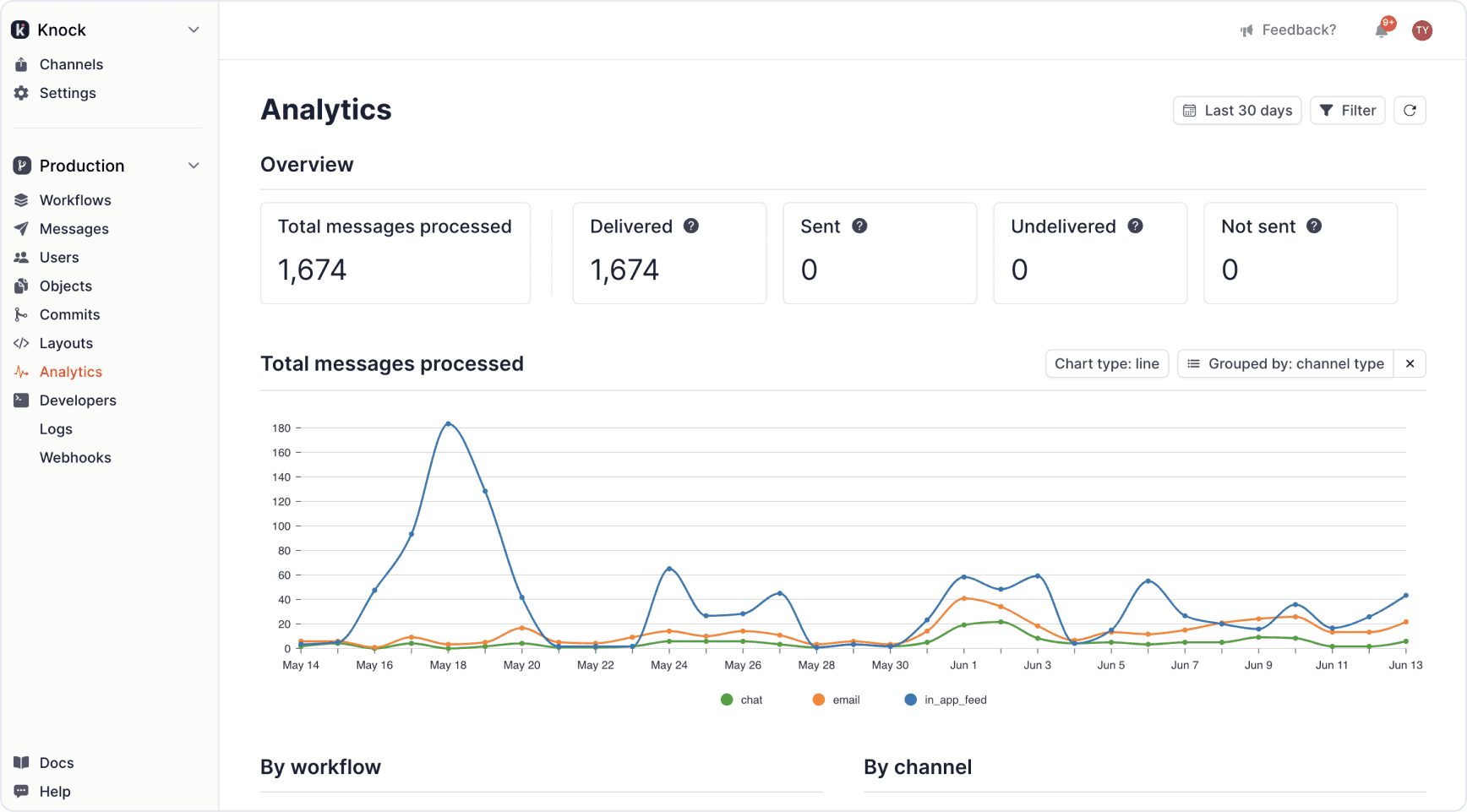 Today weβre launching Knock analytics. With Knock analytics, you get a single dashboard for understanding the notifications youβre sending across all of your Knock channels, in all of your Knock environments.