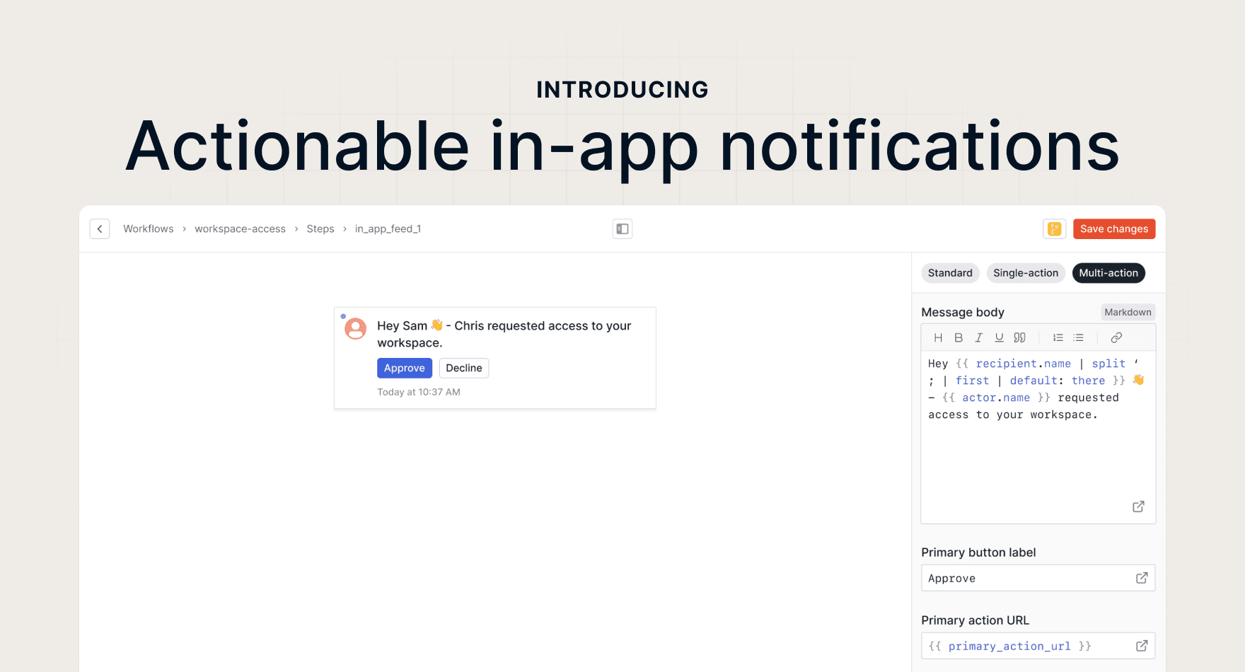 Today weβre launching an enhancement to our in-app notifications to support more actionable types of messages, without needing to drop down into code. Previously, to add inline actions to your in-app notifications you needed to customize a feed cell component. With our new in-app actions you can now toggle between a standard, single-action, or multi-action notification template directly in our template editor.