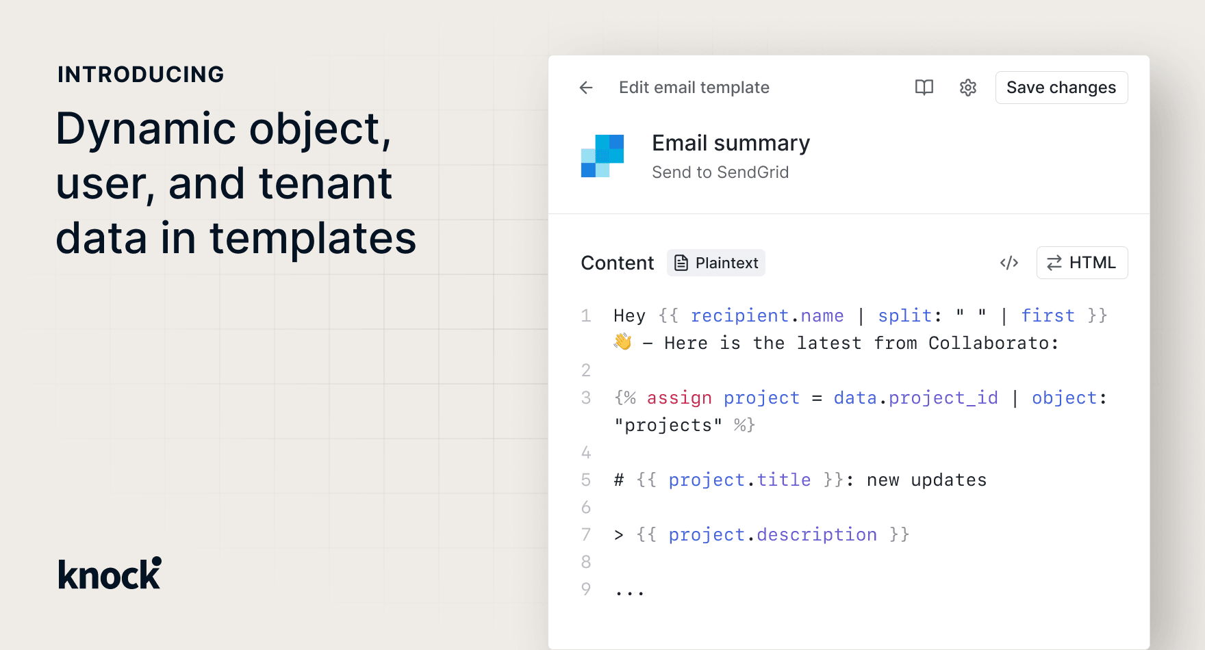 Today we're announcing support for referencing objects, users, and tenants dynamically in templates. While we've always exposed properties on the template such as the recipient, actor, and tenant, if you needed to reference other object or user data stored within your Knock environment, you had no access to that within your workflow scope.