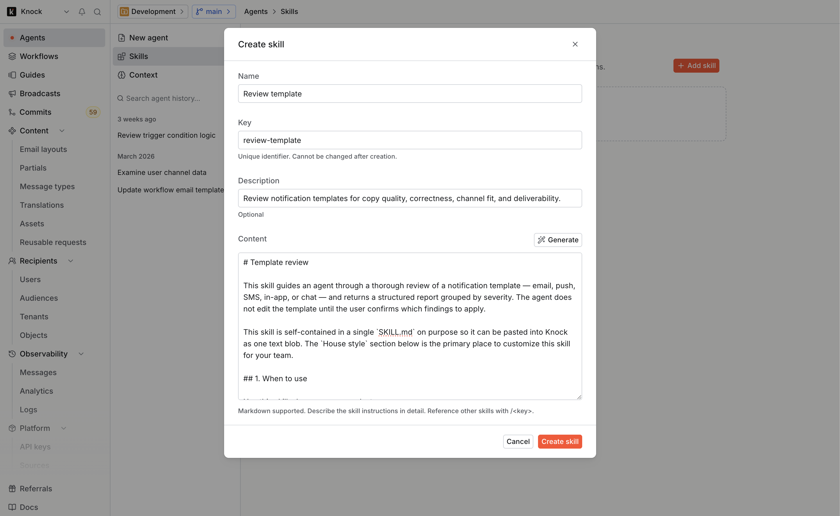 A skill is a named set of instructions you define once and reuse across your team. When you invoke a skill in the Knock agent, it runs through the steps you defined, asks for input when it needs something from you, and applies changes in place.