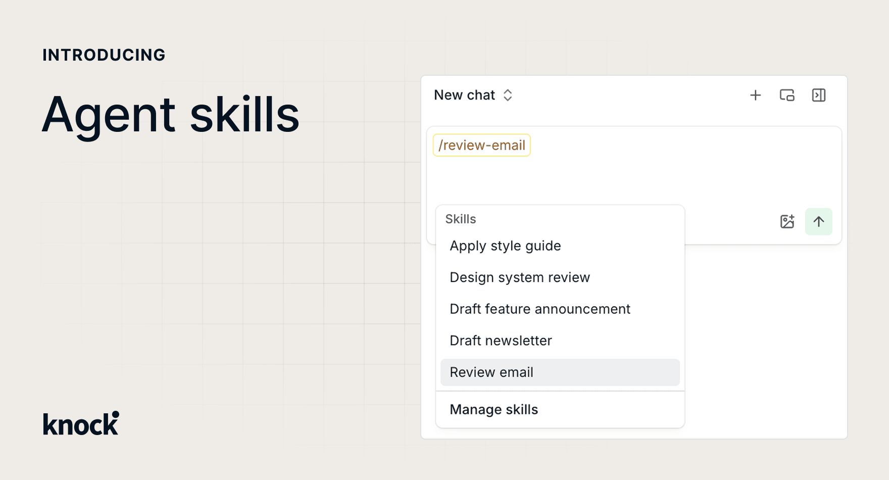 April 23, 2026Agent skillsPackage repeatable tasks into reusable commands you can run from anywhere in the Knock agent.Chris Bell