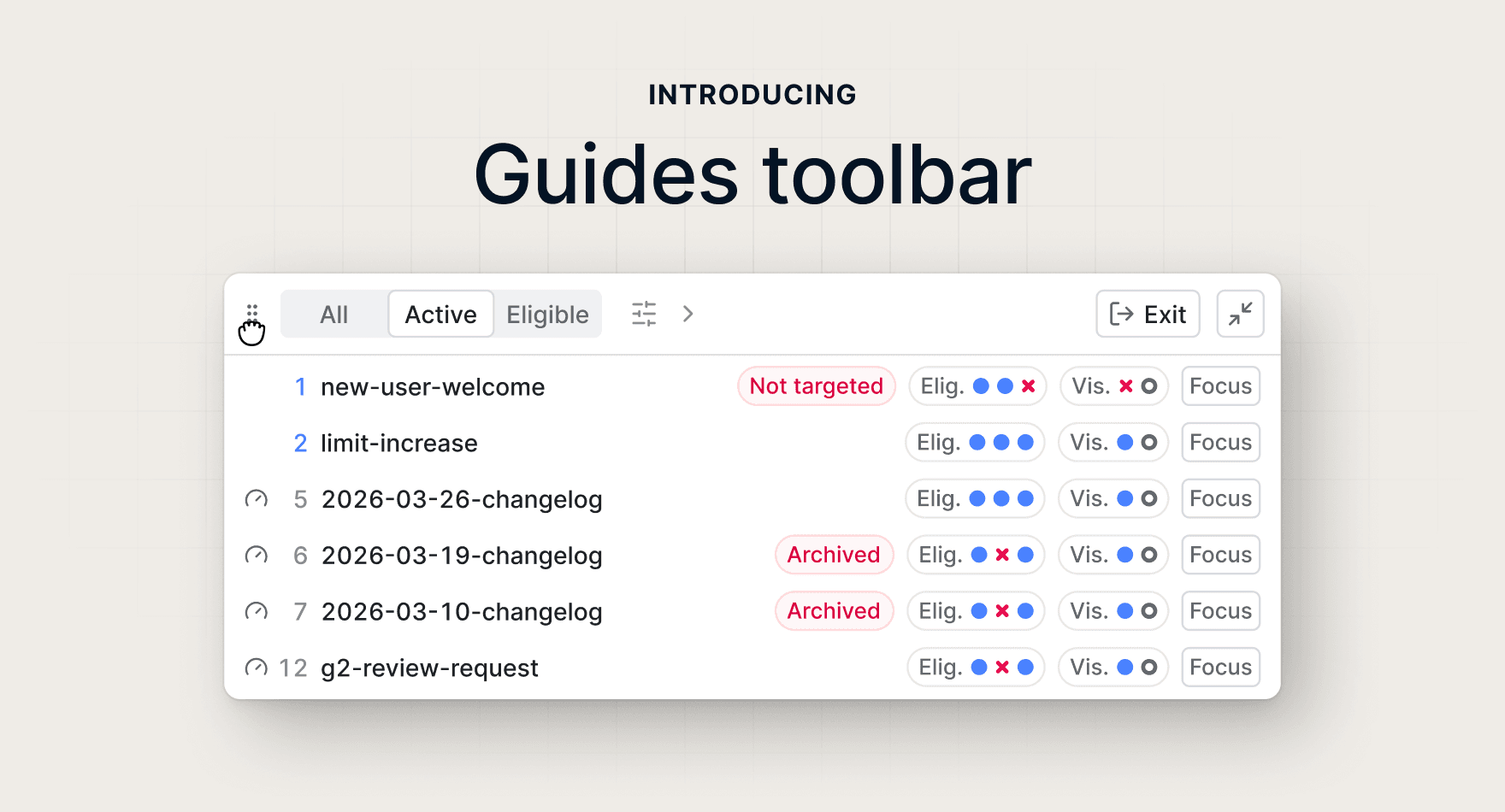 April 14, 2026Guides toolbarPreview and troubleshoot in-app guides inside your real product so you can ship messaging with confidence, settle "why isn't this showing?" faster, and keep testing from cluttering production engagement data.Thomas Yu